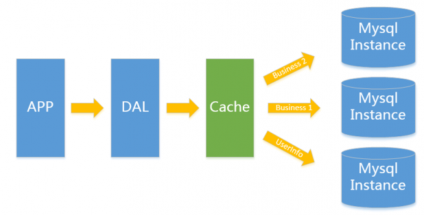 一般当V1.0 遇到瓶颈时,首先最简便的拆分方法就是垂直拆分,何谓垂直?就是从业务角度来看,将关联性不强的数据拆分到不同的Instance上,从而达到消除瓶颈的目标。以图中的为例,将用户信息数据,和业务数据拆分到不同的三个实例上。对于重复读类型比较多的场景,我们还可以加一层Cache,来减少对DB的压力。