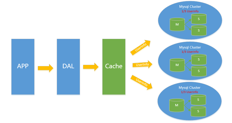 对于V2.0、V3.0方案遇到瓶颈时,都可以通过水平拆分来解决,水平拆分和垂直拆分有较大区别,垂直拆分拆完的结果,在一个实例上是拥有全量数据的,而水平拆分之后,任何实例都只有全量的1/n的数据,以下图UserInfo的拆分为例,将UserInfo拆分为3个Cluster,每个Cluster持有总量的1/3数据,3个Cluster数据的总和等于一份完整数据。
