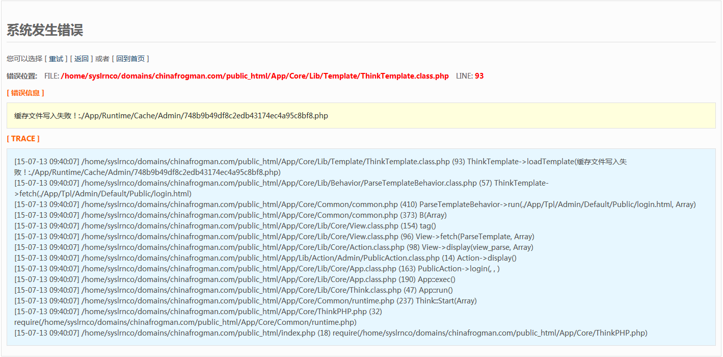 a.缓存文件没有写入权限 b.runtime文件不存在 c.空间磁盘已满,无法写入