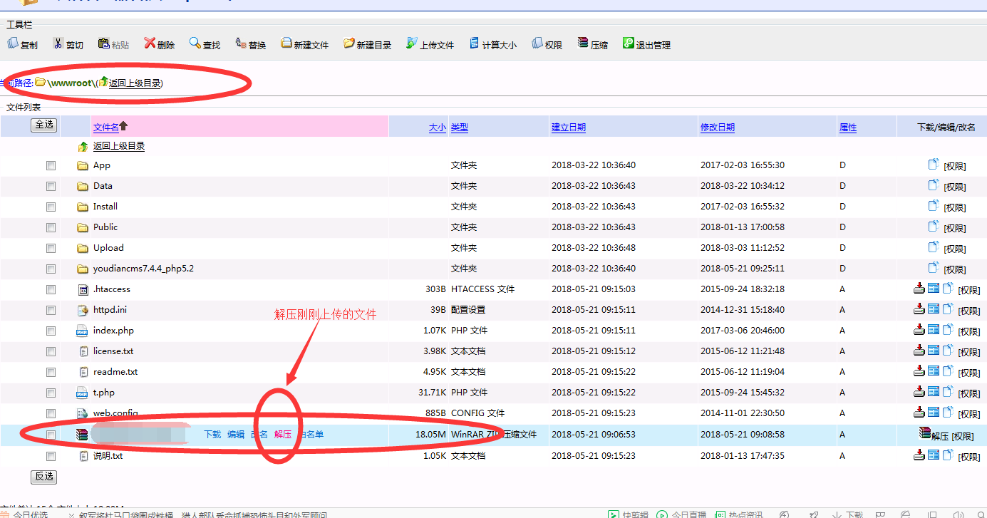 4 、打开文件管理-解压刚刚上传的程序文件